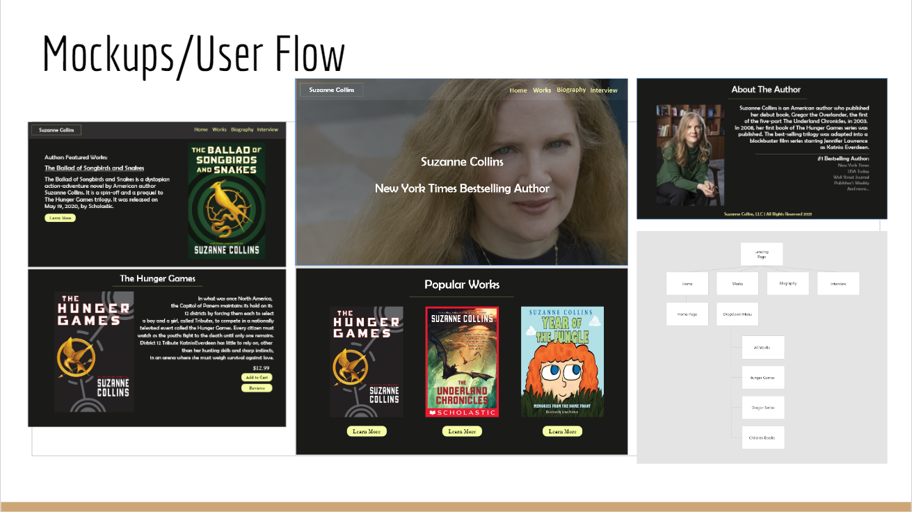 This project was focused on the famous author, Suzanne Collins. She has her own site revolving around her history, her works, and awards. However, her original site is not the greatest. This case study focsues on how I can redesign the overall user experience and navigation for her site, while keeping and recognizing her works as an amazing author.