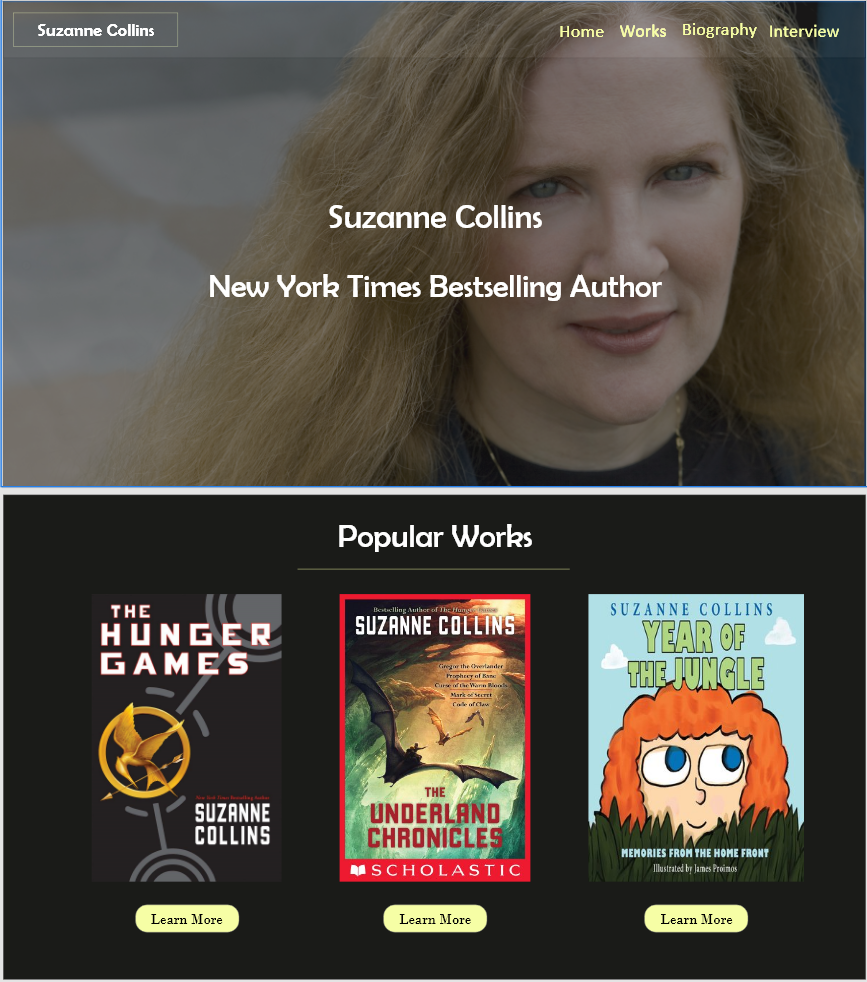 In the end I was able to create a site that incorporates proper user navigation around Suzanne Collins' work. There are designated pages for her works and awards, as well as a simple layout. I have focused on the key points of who Suzanne Collins is, and what she is known for. It is important to focus on key aspects for a certain site, and I wanted to create a site that is pleasing to the eye, and that the site is approachable to readers of all ages.