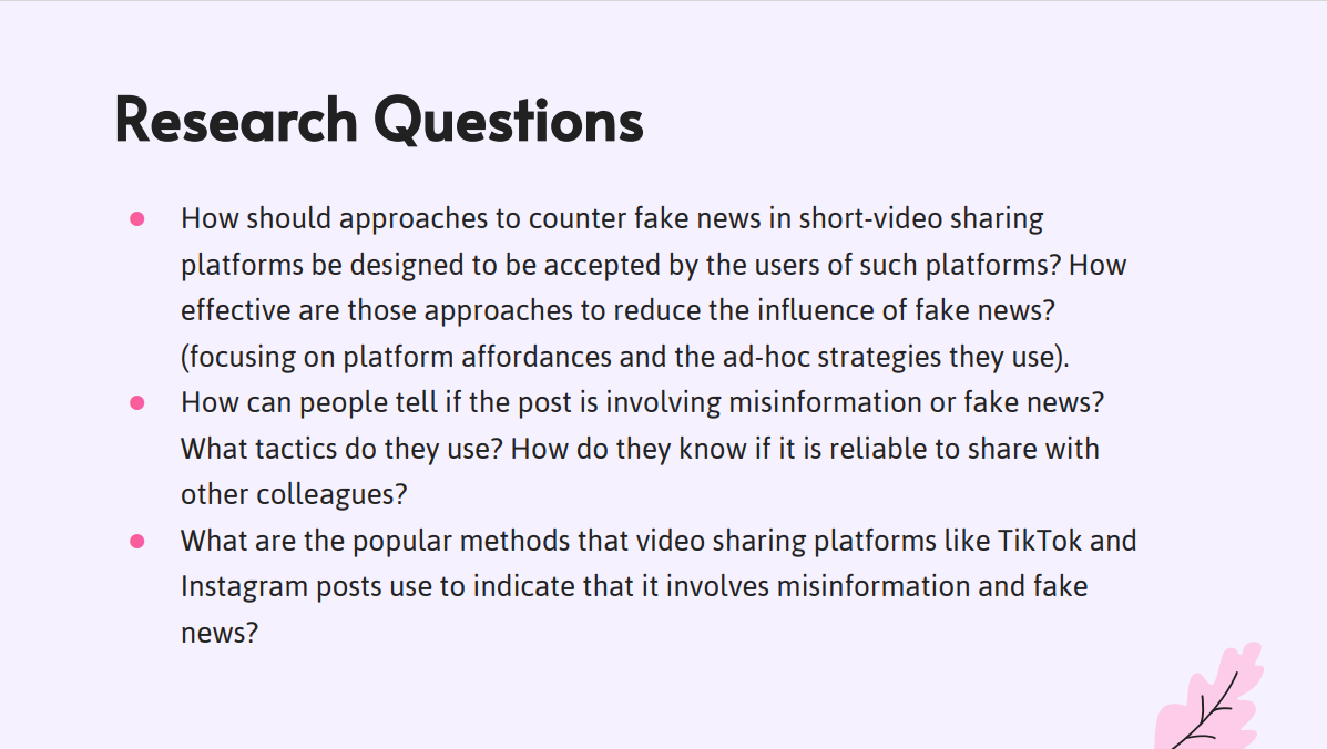 These individuals were asked to perform a think aloud operation during the interview. They were shown through a simulation of TikTok videos, and the goal was to see if they were able to identify what video invovled misinformation or fake news. A key feature that was added to the videos, was a warning/fact-checking alert attached to the video. They were able to identify which video had misinformation invovled in it. Some key points that were taken through this research were that people appreciate the usage of warnings attached to short videos, so that the viewer can be informed that the video could be a relation to misinformation and fake news.